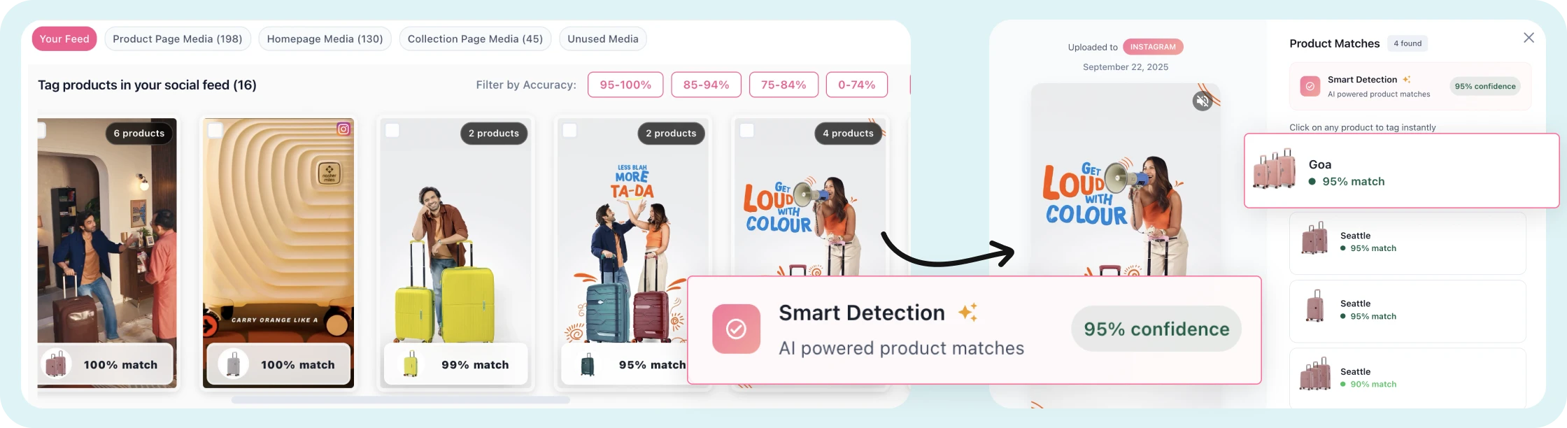 Nasher Miles implemented a video commerce strategy that auto-syncs Instagram videos daily and tags them with products using smart matching (95%+ accuracy). This automation reduced manual effort and enabled seamless integration across the site.